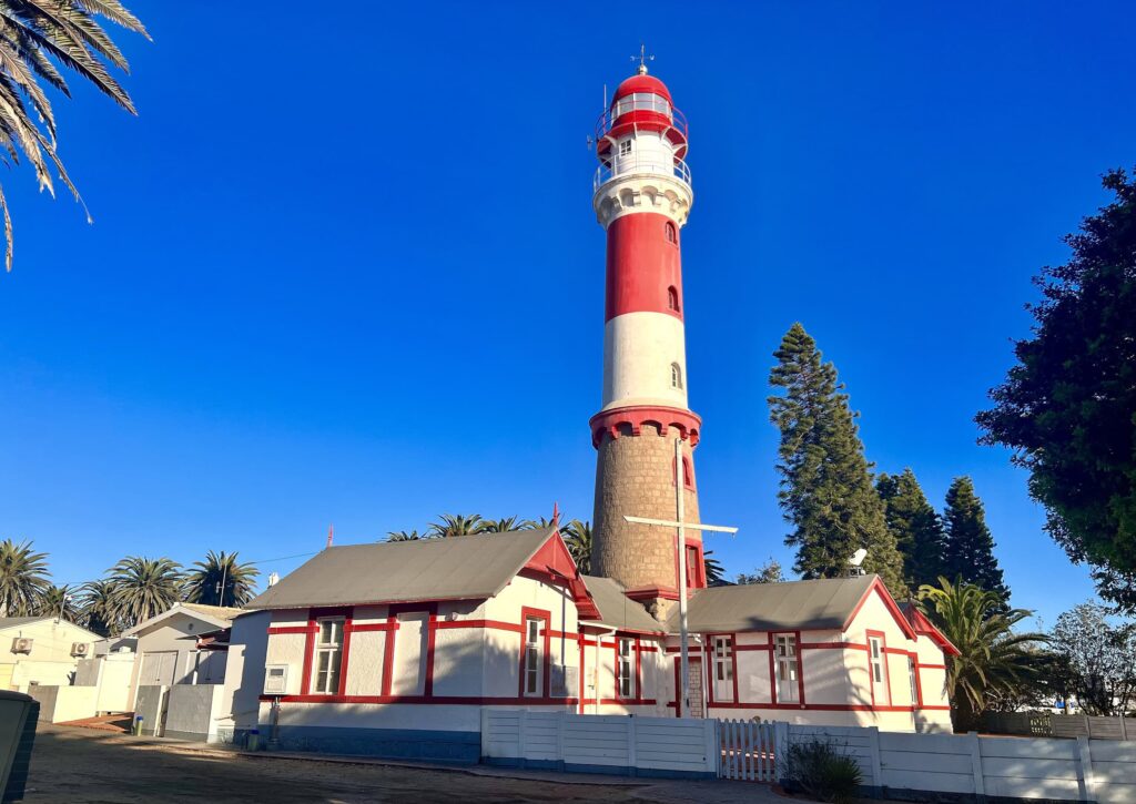 The nearby lighthouse, built in 1903, replaced an older wooden structure from 1892 that couldn’t withstand the ocean winds and the shifting desert sands. With a further expansion in 1910, it reached its current height of 21 meters, making it one of Swakopmund’s tallest buildings, visible from most parts of the town.