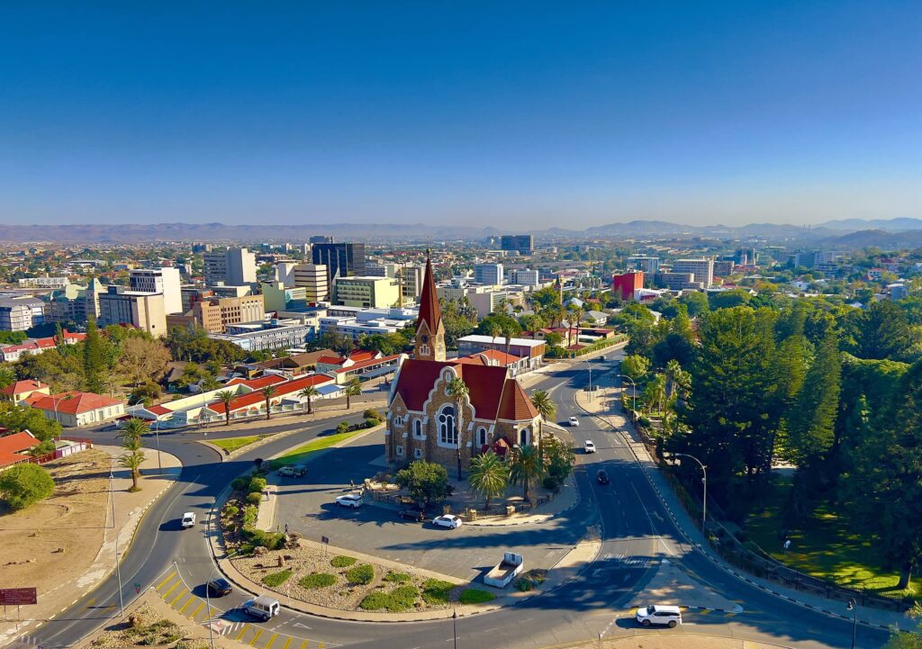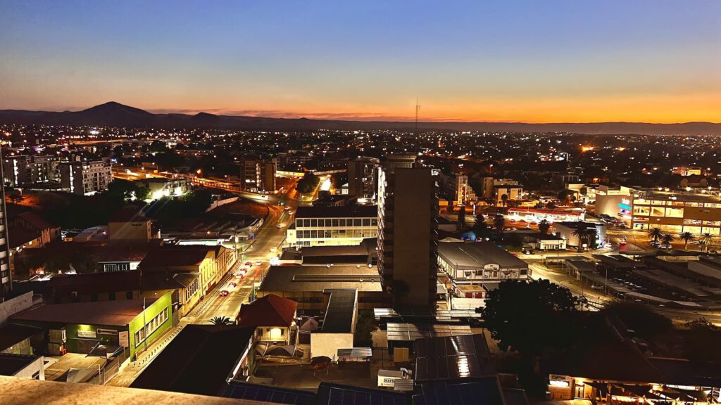 Windhoek, the capital of Namibia, is a small city in a country with a population of only 2.7 million but a land area more than twice that of Germany. The cityscape is dominated by low-rise buildings, with a few taller structures near the Hilton and the neighboring Avani Hotel. These hotels boast lovely skybars that offer some of the best views of Windhoek. The sunsets from these vantage points are truly spectacular and not to be missed!